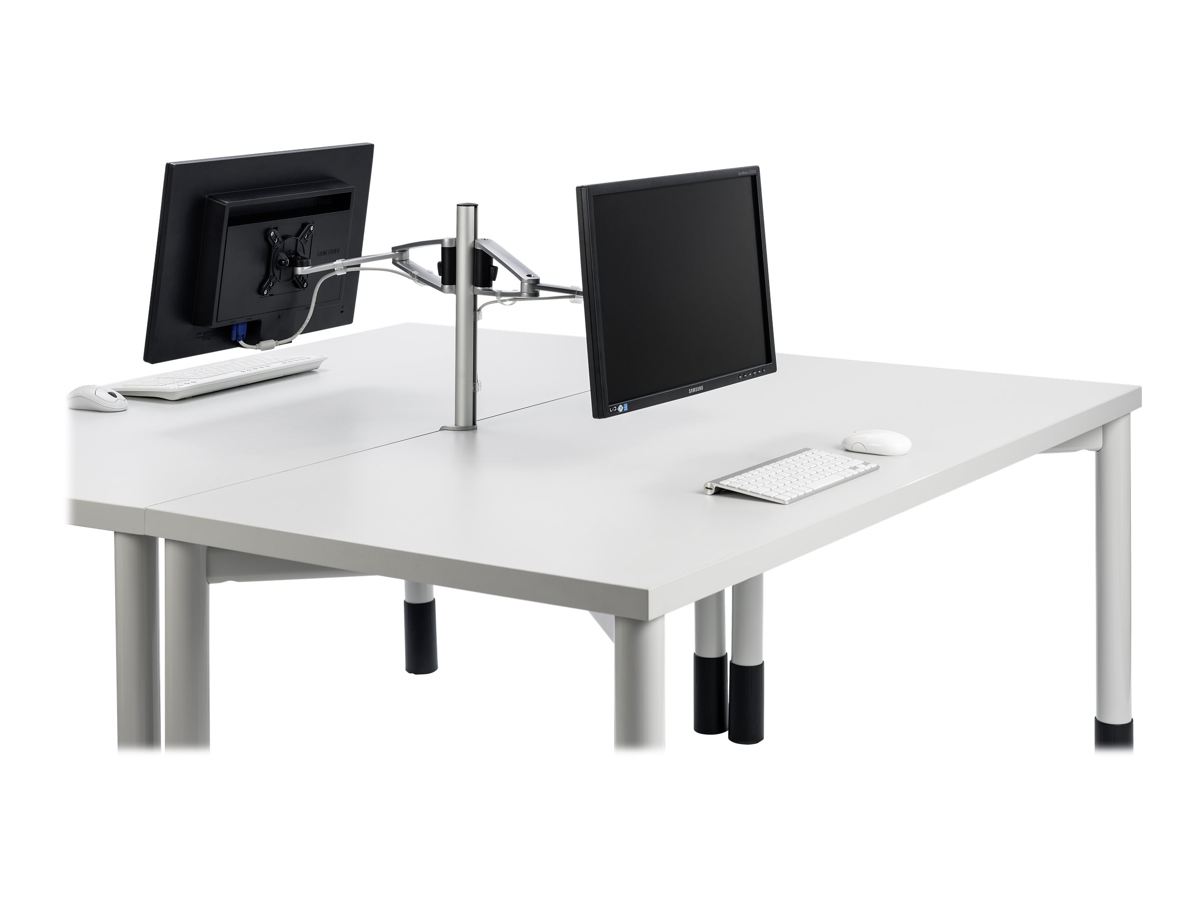 Description Porte-moniteur élégant pourvu de deux bras articulés réglables en hauteur en continu. Tous les produits de la marque